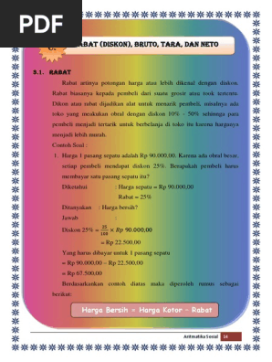 20:13 di video ini dijelaskan materi tentang aritmatika sosial, yang merupakan materi kelas vii smp. Aufrufe 144 tsd.vor 3 years. Sebuah toko memberi diskon sebesar 25 % untuk semua jenis barang yang dijualnya. Adapun sub materi dalam soal ini meliputi harga jual, harga beli, untung, rugi, persentase untung, persentase rugi, bruto, netto, tara, bunga dan pajak. Evaluasi hasil belajar matematika aritmatika sosial oleh :